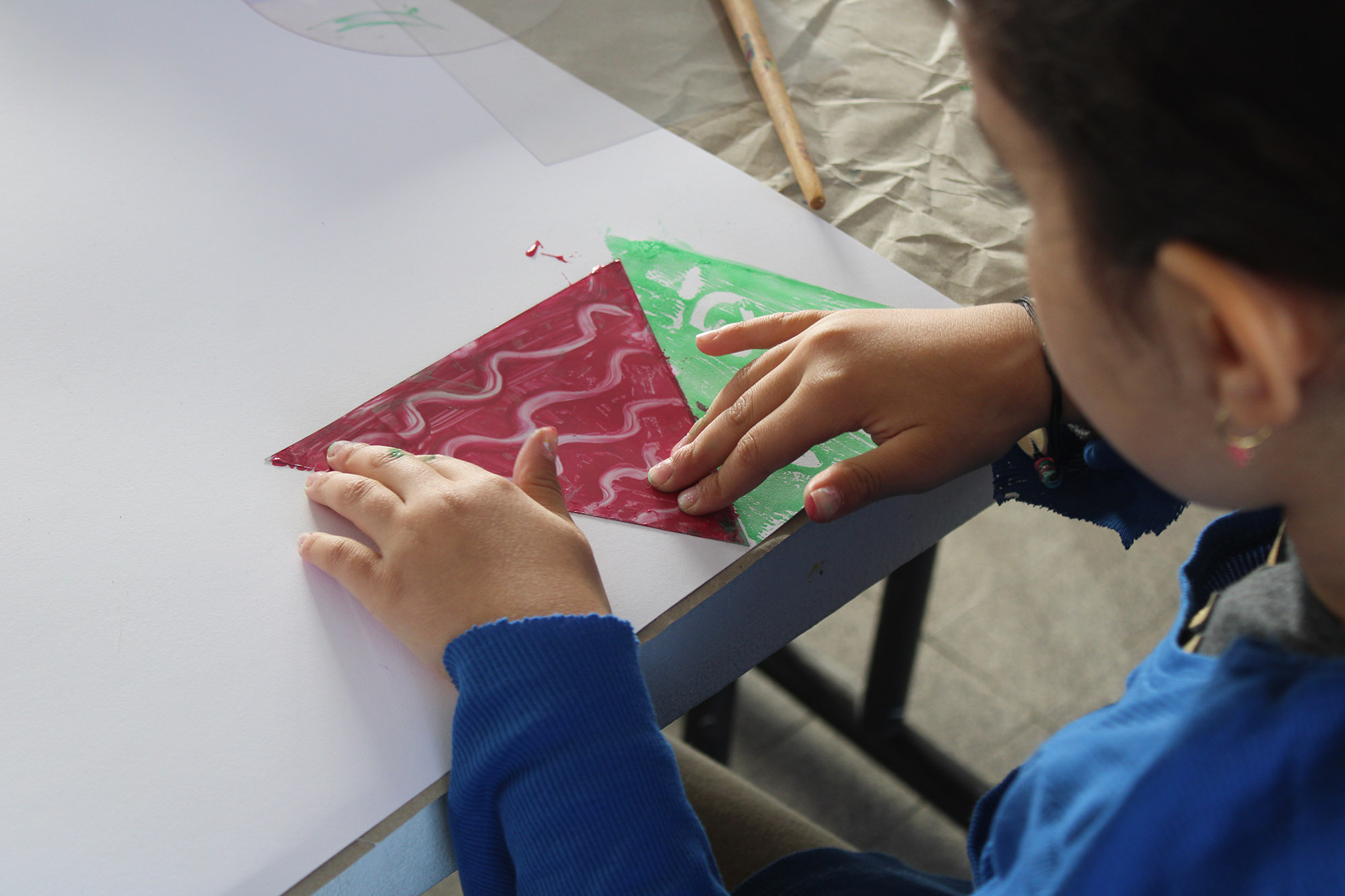| La technique du monotype consiste à peindre sur un support non poreux (plastique, métal) puis à imprimer cette peinture sur une feuille de papier. Dans cet atelier, chaque enfant dispose de 3 supports en plastique de forme différente : un cercle, un carré et un triangle (qui peuvent se combiner pour créer des motifs ou des constructions).. Une fois le support recouvert de peinture les enfants peuvent y dessiner des motifs au doigt, avant de le retourner et de l'imprimer sur leur feuille. |