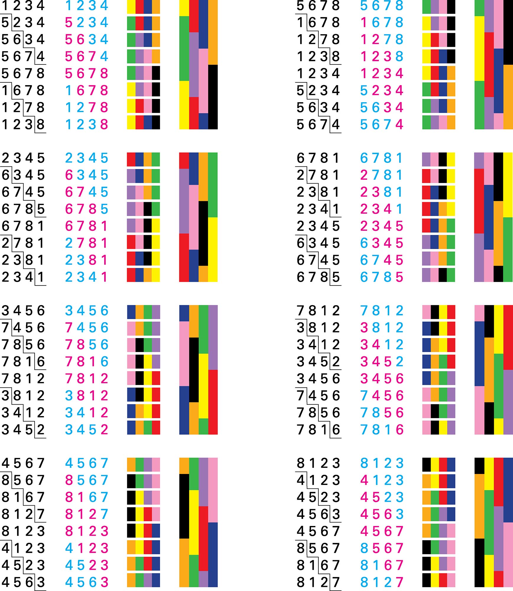 | LES MARCHES QUATRE À QUATRE Principe de composition (Procédé utilisé pour déterminer l'ordre des couleurs) On utilise 8 couleurs. 2 marches consécutives ne peuvent être de la même couleur. On compose des phrases de 4 marches, soit 4 couleurs. En modifiant un chiffe par ligne, on effectue un décalage progressif en escalier de la première phrase (1234) vers la dernière phrase (5678), avant d'effectuer le chemin retour, sans toutefois revenir à la première phrase (on s'arrête à la précédente) : ![]() On obtient ainsi un cycle de 8 phrases. On va maintenant répéter ce cycle mais en effectuant, à chaque répétition, un glissement dans l'attribution des couleurs liées à chacune des marches. À cet effet on réalise l'opération x+1 pour chacune des valeurs : 1 devient 2, 2 devient 3, 3 devient 4, etc. On obtient ainsi la suite complète des couleurs, soit 8 cycles de 8 phrases. Dans la suite complète chaque phrase apparaît 2 fois, mais au sein de séquences différentes. ![]() |