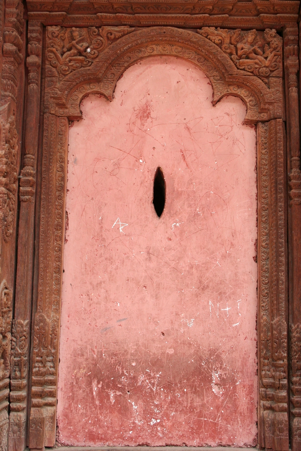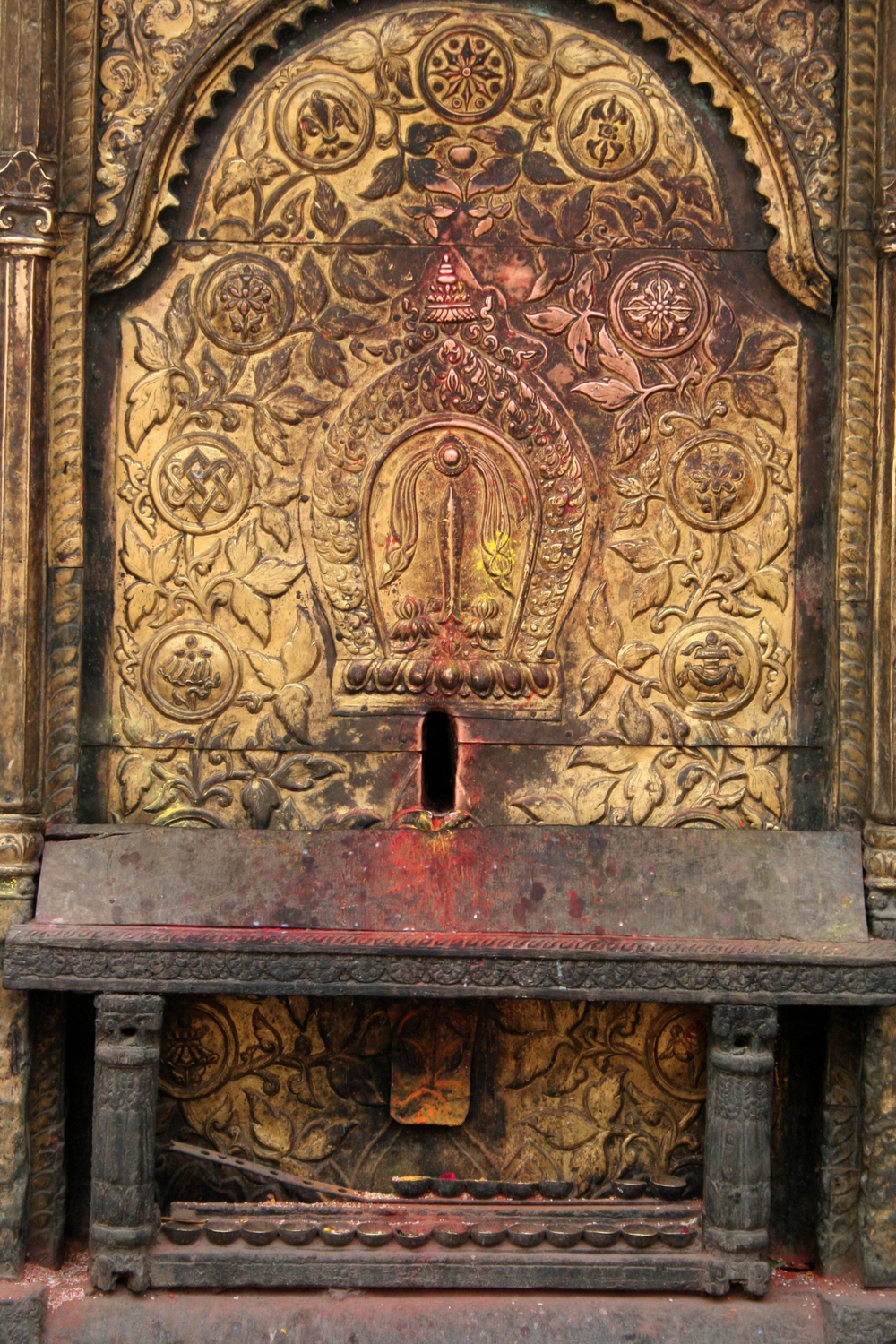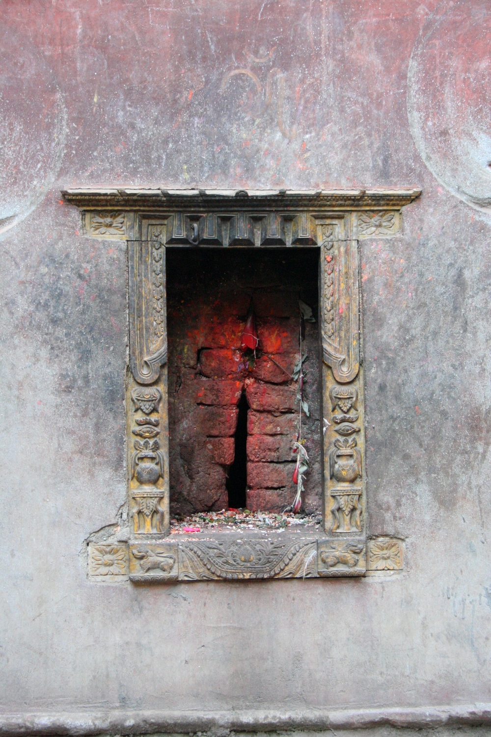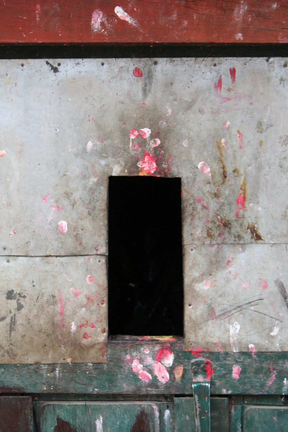 | Fentes dans l'enceinte extérieure des temples, ouvertes sur la chambre utérine. (photos prises au Népal - avril 2010) |