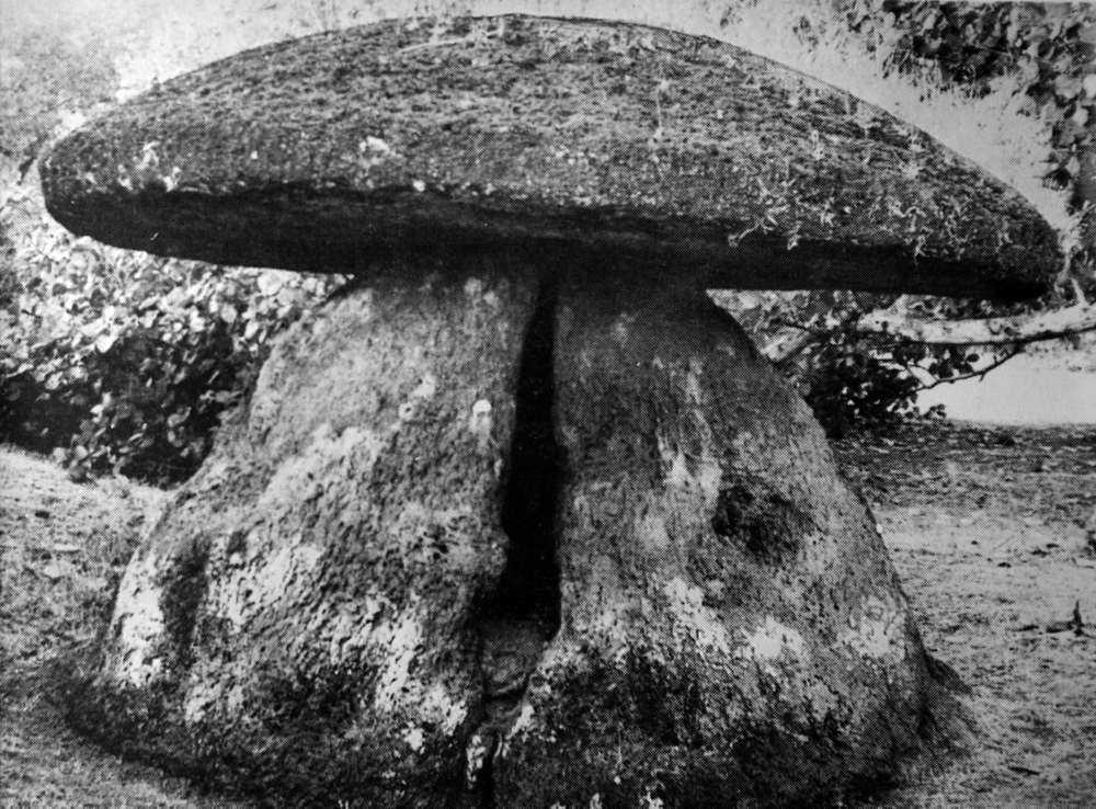 «Temple» mégalithique : toit voûté surplombant un étroit passage yonique qui mène à une chambre utérine. Kerala, sud-ouest de l’Inde |
