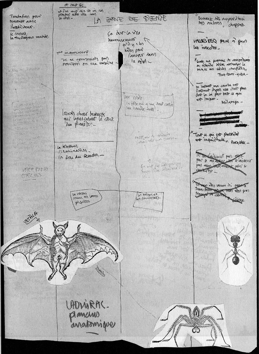 ![]() La zone de silence, panneau mural que Nicolas Bouvier avait accroché au mur de sa chambre pour écrire Le Poisson-Scorpion. On y trouve des notes relatives à l'écriture de son texte, quelques bestioles et diverses citations, notamment celle-ci de l'alchimiste Paracelse : " Tout ce qui est pluralité est inquiétude". |
