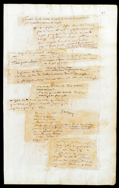 ![]() Un feuillet des Pensées de Blaise Pascal Manuscrit autographe, 1656-1662 498 p. précédées des f. A-E, 43 x 28 cm BNF, Manuscrits, Fr. 9202, f. 47 Les "colliers de pensées" de Pascal Tout a été dit à propos de l’écriture pascalienne sans aboutir jamais à une absolue élucidation. Il semble pourtant que l’on puisse aujourd’hui arriver aux conclusions suivantes : Pascal prenait des notes sur de grandes feuilles de papier, plaçant une petite croix devant chacune des "pensées" et les séparant d’un trait de plume qui lui permettait ensuite de découper les fragments et de les rassembler en liasses, méthode assez commune au demeurant en son temps. Quelque deux cents trous d’enfilure témoignent encore de ces "colliers de pensées", selon le mot de Jean Guitton. (BNF) |