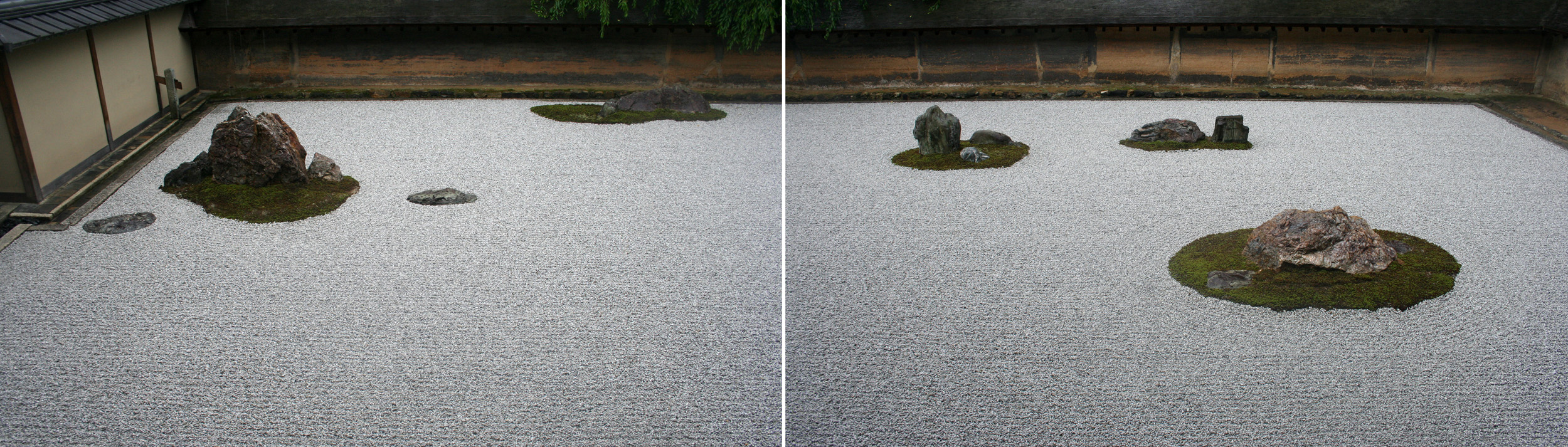 | Le jardin du Ryoan-ji est composé de 15 roches réparties dans une mer de graviers. La totalité des roches ne peut être perçue simultanément. D'où que l'on se trouve, il en reste toujours une qui se dérobe au regard. |