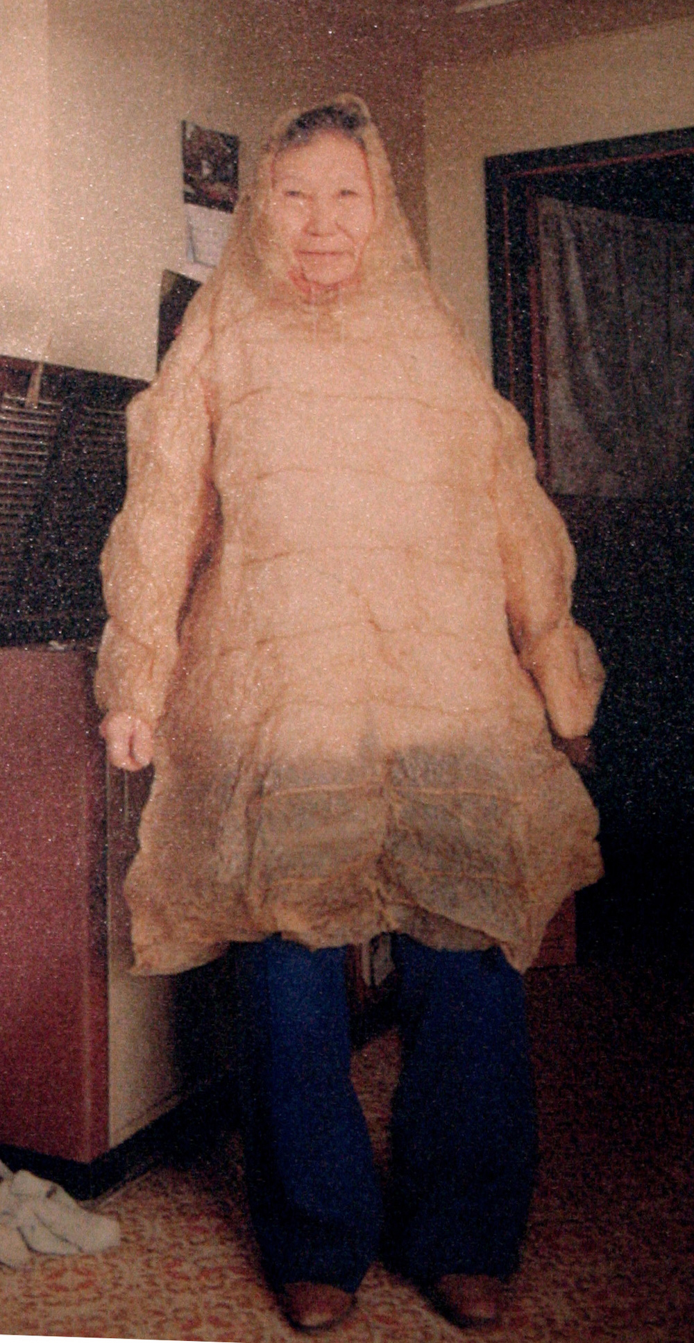 Flora Nanuk "modelant" une parka. années 80 , Hooper Bay, Alaska (source: British Museum, photographe : J.King) |
