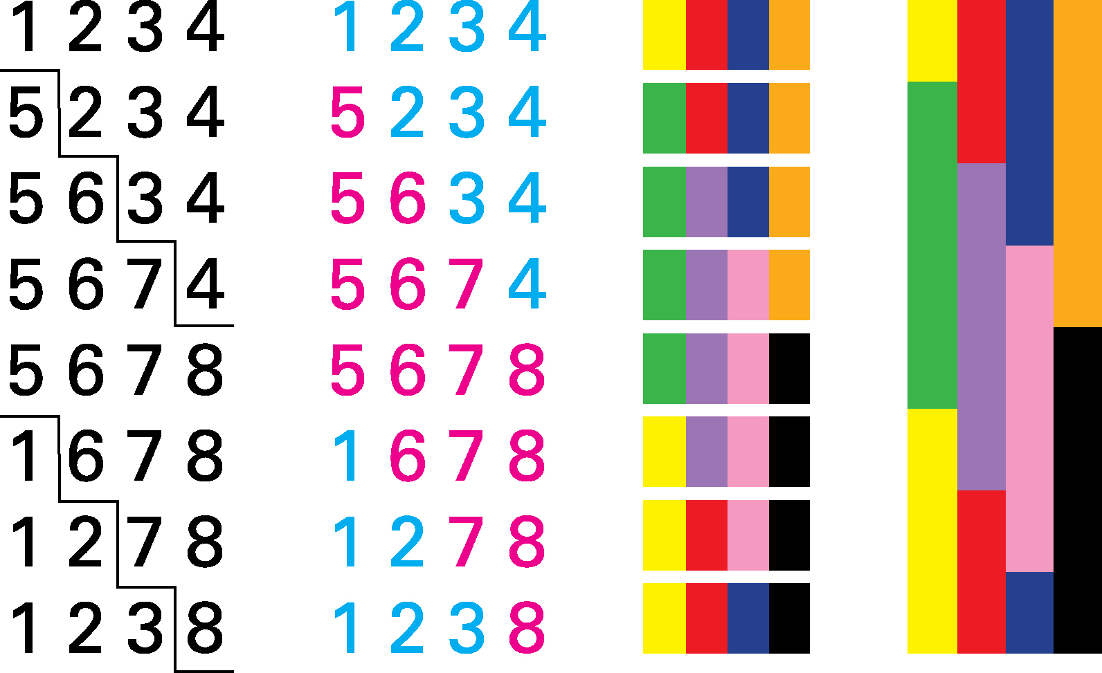 | LES MARCHES QUATRE À QUATRE Principe de composition (Procédé utilisé pour déterminer l'ordre des couleurs) On utilise 8 couleurs. 2 marches consécutives ne peuvent être de la même couleur. On compose des phrases de 4 marches, soit 4 couleurs. En modifiant un chiffe par ligne, on effectue un décalage progressif en escalier de la première phrase (1234) vers la dernière phrase (5678), avant d'effectuer le chemin retour, sans toutefois revenir à la première phrase (on s'arrête à la précédente) : ![]() On obtient ainsi un cycle de 8 phrases. On va maintenant répéter ce cycle mais en effectuant, à chaque répétition, un glissement dans l'attribution des couleurs liées à chacune des marches. À cet effet on réalise l'opération x+1 pour chacune des valeurs : 1 devient 2, 2 devient 3, 3 devient 4, etc. On obtient ainsi la suite complète des couleurs, soit 8 cycles de 8 phrases. Dans la suite complète chaque phrase apparaît 2 fois, mais au sein de séquences différentes. ![]() |