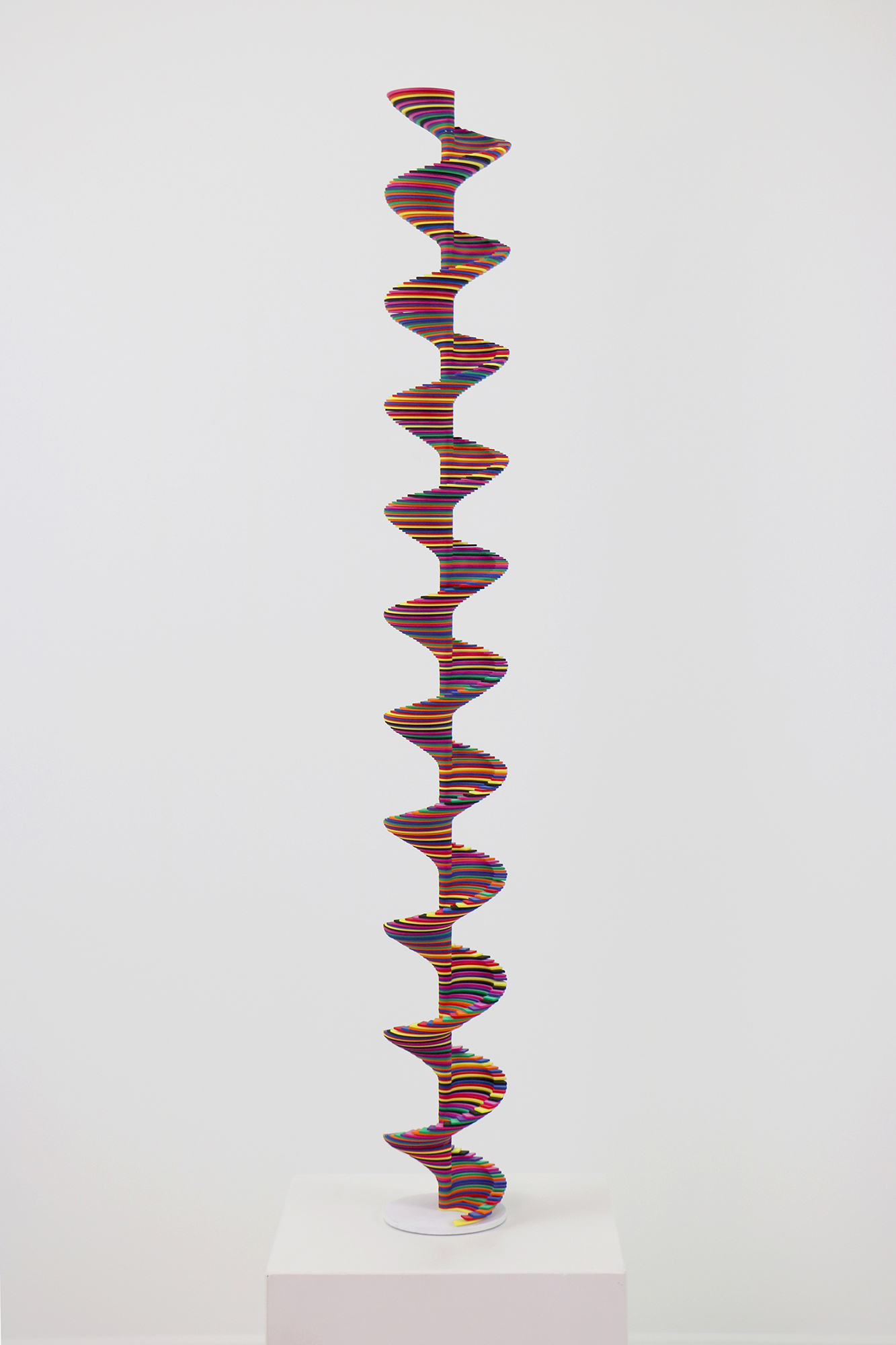 | 2025 mousse de caoutchouc, socle en aluminium, PVA et carton hauteur 100cm, diam.11cm Structure hélicoïdale composée de 512 lamelles de caoutchouc découpées et enfilées sur un profilé en aluminium de manière à constituer un escalier en vis dont chaque marche est en arc de cercle. Les couleurs des marches sont déterminées selon un procédé de décalage "en escalier", dont la progression vise à produire un maximum de diversité colorée en contrepoint de la régularité de la silhouette. _____________________________________________________________ Même statique, l'hélice circulaire transmet le sentiment cinétique d'un mouvement sans fin. Son tracé croît simultanément sur plusieurs plans : elle tourne sur elle-même (surface) tout en avançant (profondeur). Sa vrille "monte" ou "descend" selon le sens de rotation qu'on lui impulse. C'est une sœur éloignée de la spirale, dans sa forme comme dans son étymologie. Sa beauté, comme celle des colonnes torses baroques, réside peut-être dans la tension qui s'instaure entre la rectitude de son axe central, qui semble fixe, et le mouvement d'enroulement sans fin de sa ligne de bordure. > VOIR LE PROJET > Procédé de COMPOSITION ![]() |